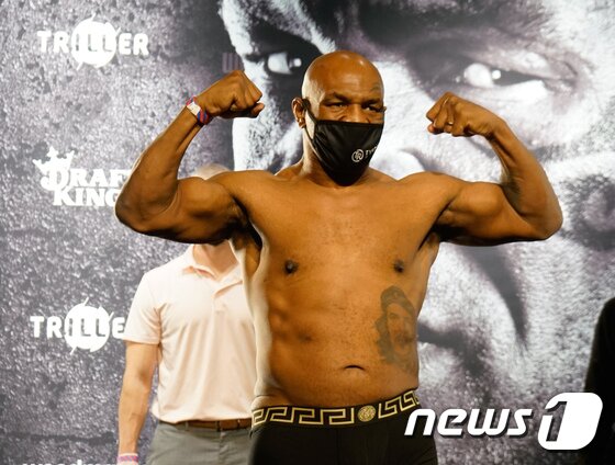 | 전설적인 복서 마이크 타이슨이 27일(현지시간) 계체를 마치고 포즈를 취하고 있다. © 로이터=뉴스1 © News1 박형기 기자 |