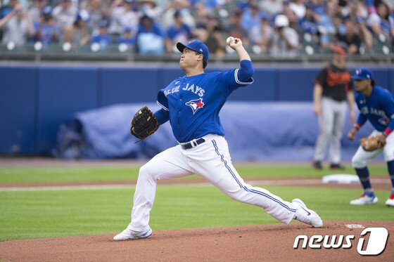 | 토론토 블루제이스의 류현진이 27일(한국시간) 미국 뉴욕주 버팔로의 세일런필드에서 열린 볼티모어 오리올스와의 경기에서 힘차게 공을 던지고 있다. © 로이터=뉴스1 |